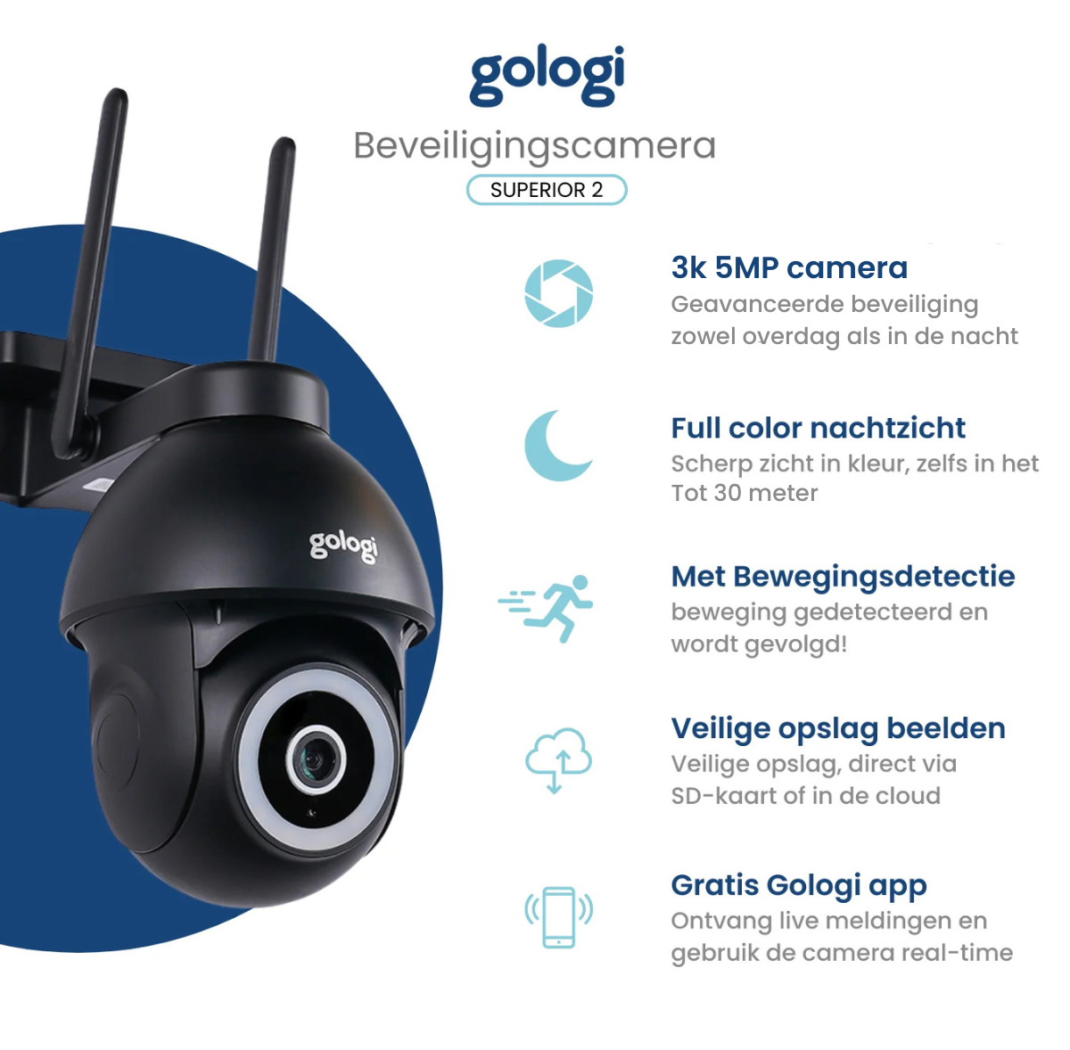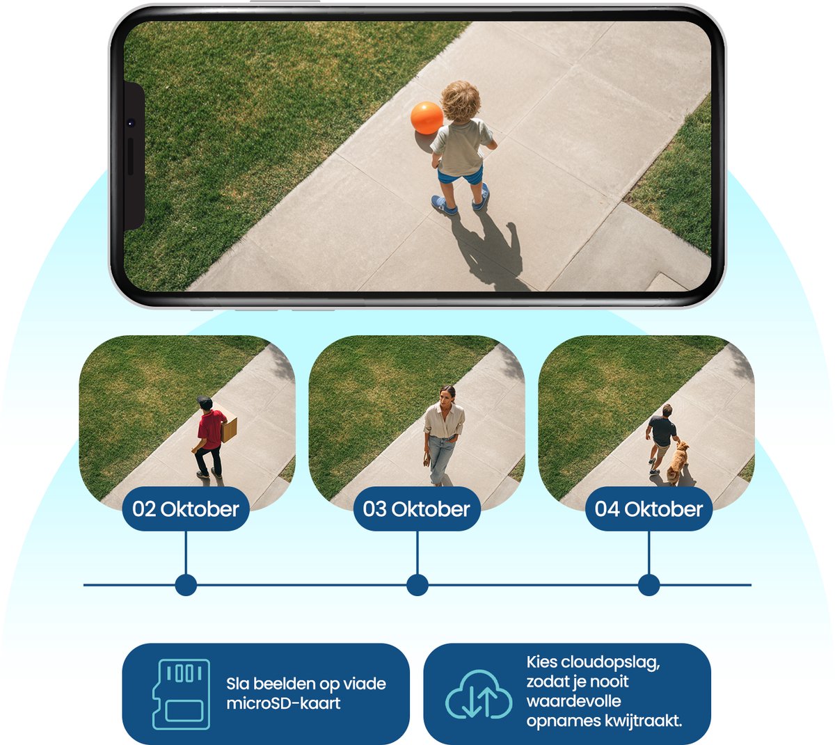 Met Gologi bepaal je zelf waar je videobeelden worden opgeslagen. Kies voor een micro-SD-kaart als je het lokaal wilt beheren, of ga voor online opslag in de cloud om alles veilig en altijd toegankelijk te houden – zelfs als je camera beschadigd raakt. Zo heb je altijd controle, op jouw manier.